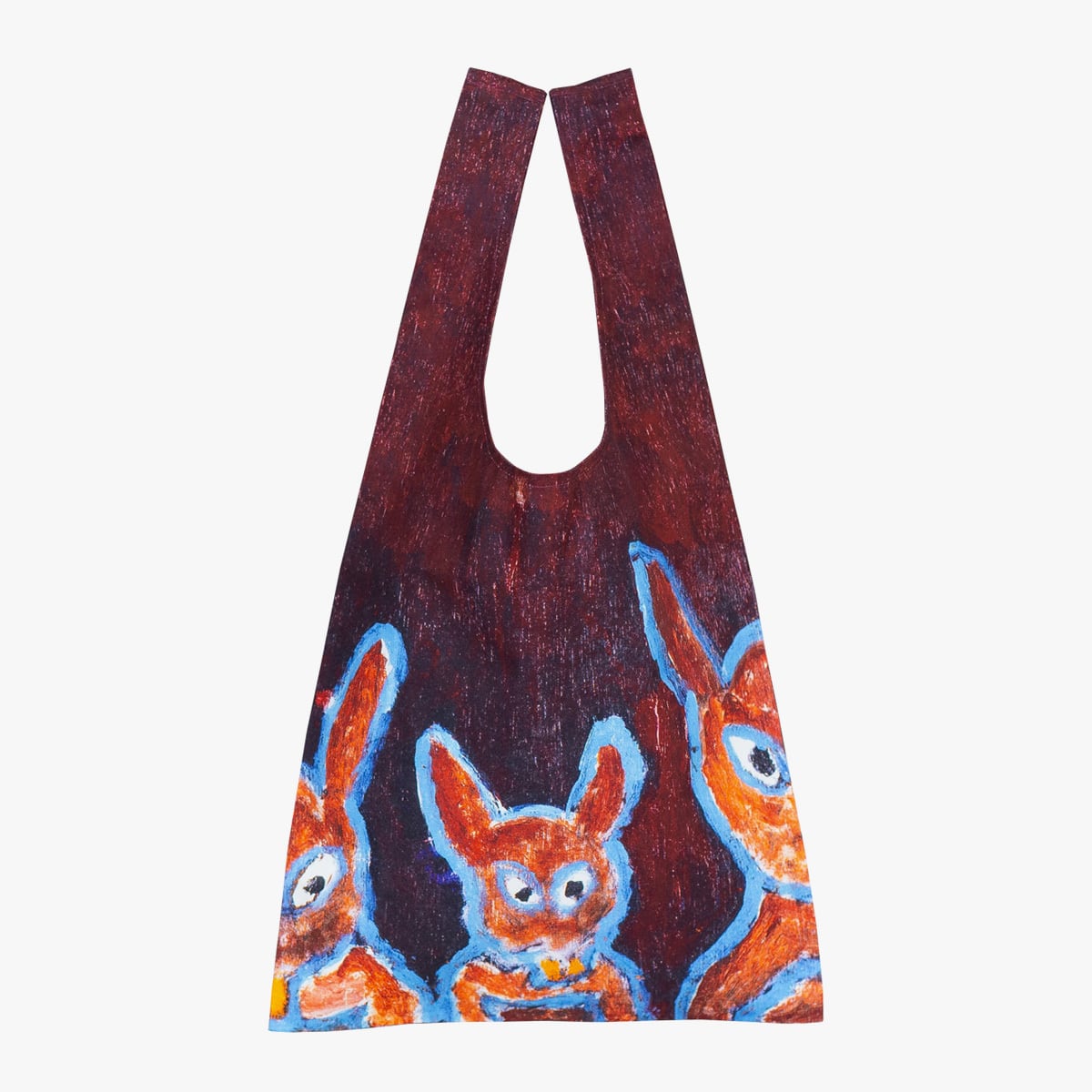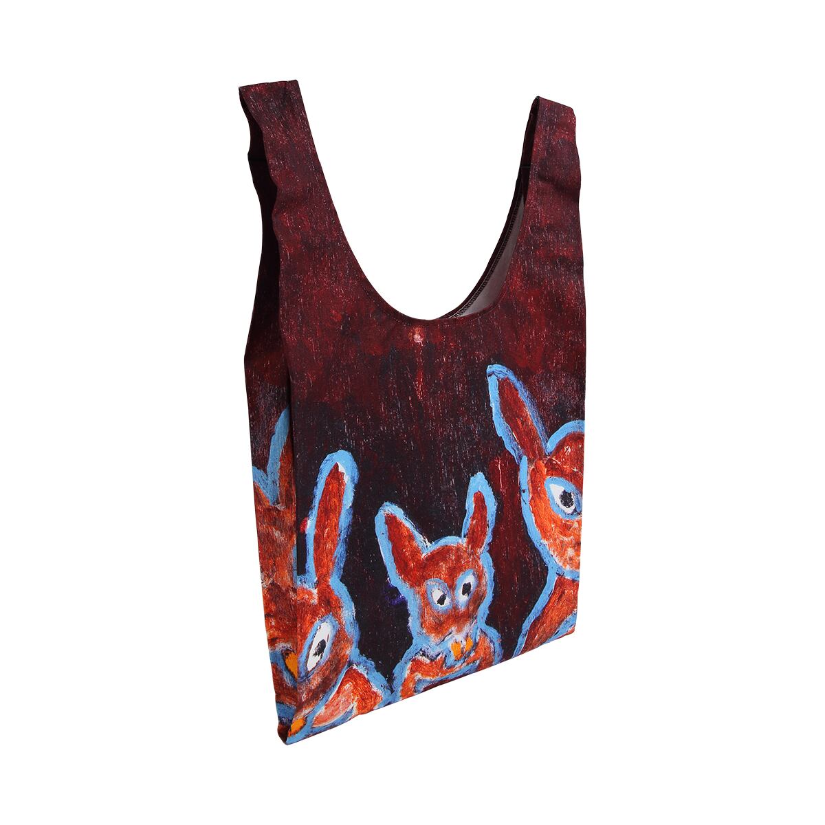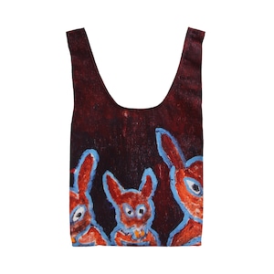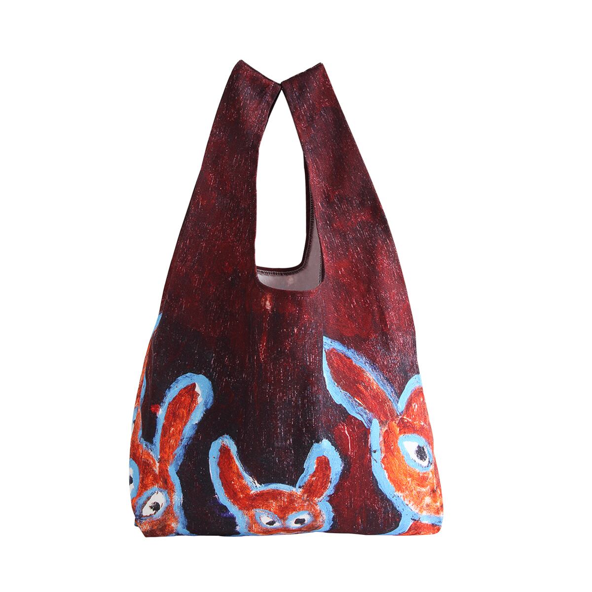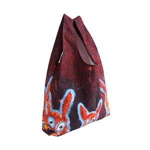 小笹逸男の代表的な作品のひとつ。ツンとつり上がった目とすぼんだあご(鼻!?)。そして右の猫が少し見切れてしまっているところにユーモアを感じます。エコにアート。お買い物袋タイプのマルシェバッグ。小さく折りたためるのでバッグに入れておくと便利です。