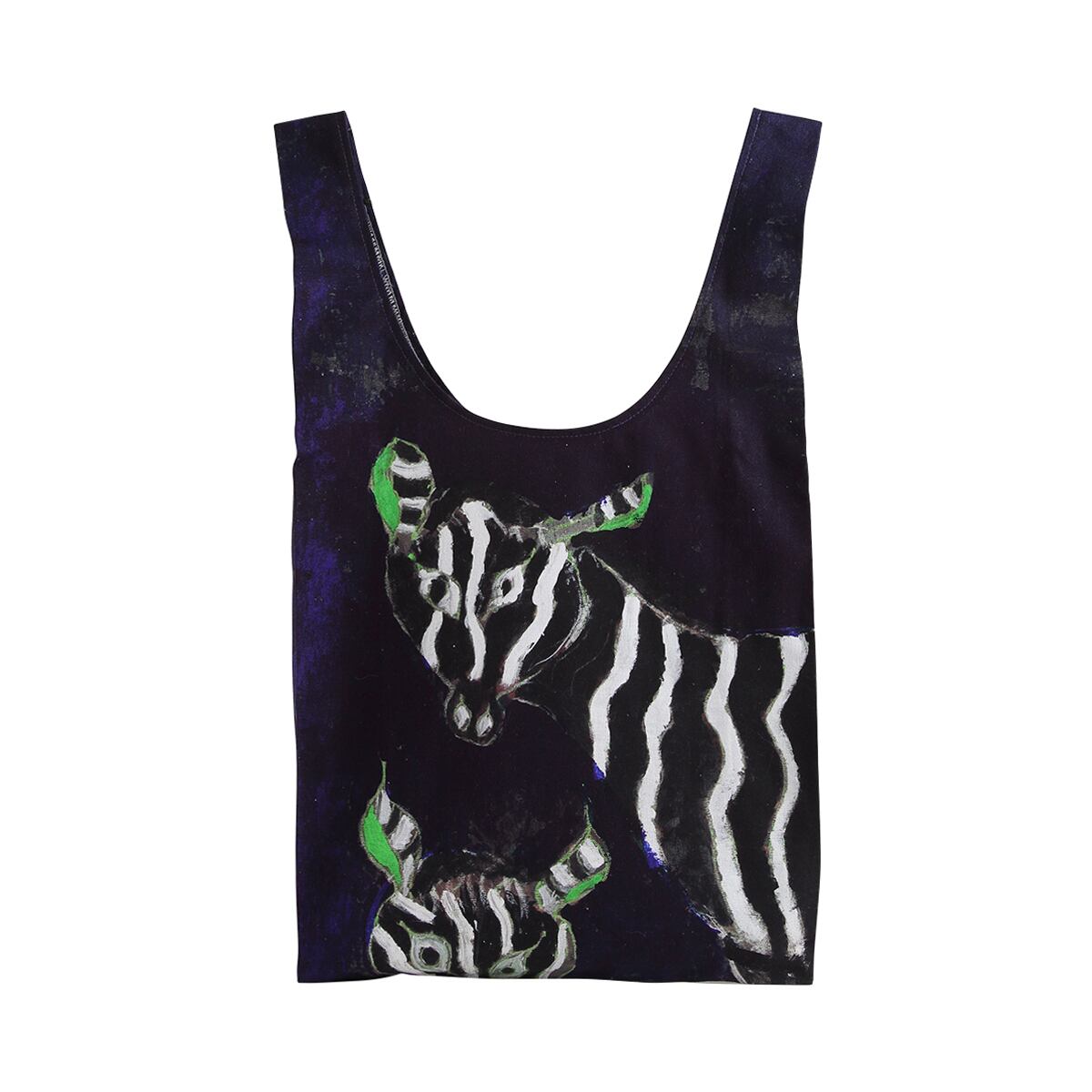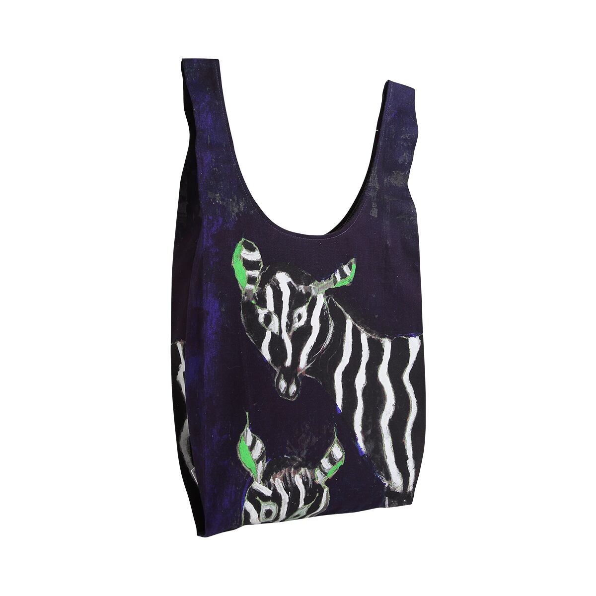 夜を彷彿とさせる深い青色を背景に佇む2頭のシマウマ。よく見ると目元や耳が黄緑色に縁取られていて、配色と構図の美しさから人気のある作品です。