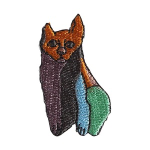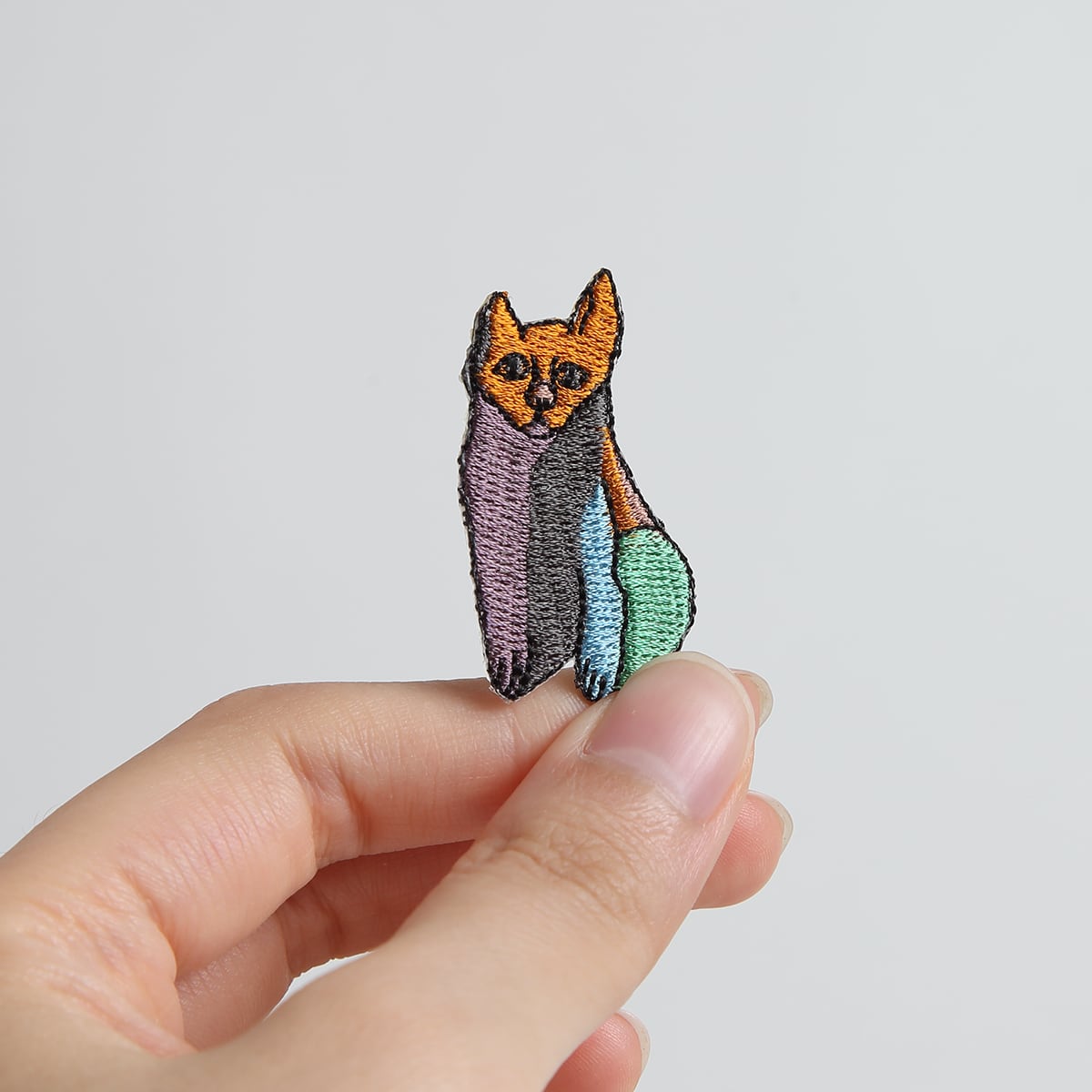 何色にも色分けされた背景の中で佇む2匹の猫たちもまた、体のパーツが細かく色分けされています。その鮮やかな色彩と細身の身体が相まって、古代エジプトの猫の神様を彷彿とさせます。