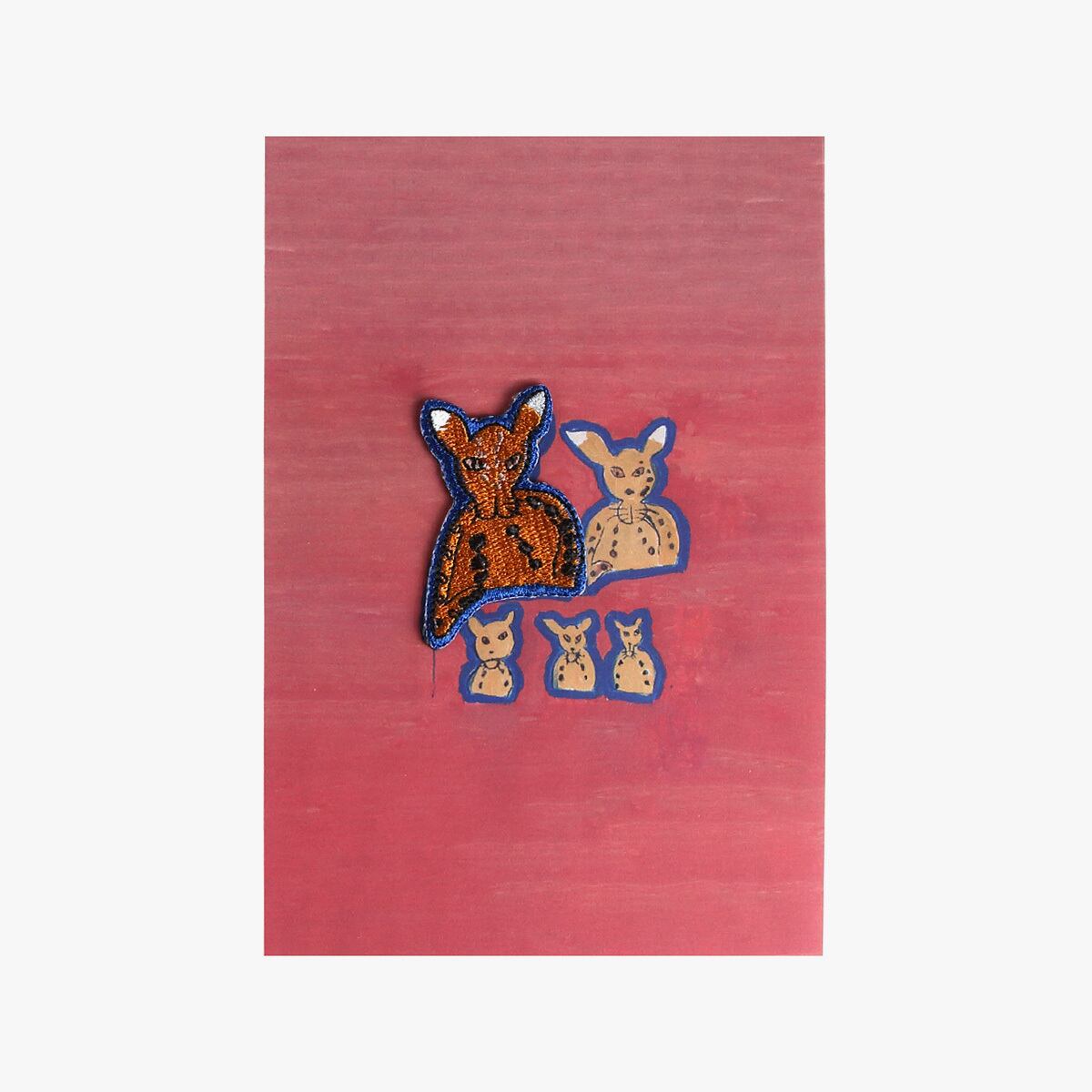 大きな2匹が親で、その下にいるのは遊び盛りの3兄弟でしょうか。黄色い体がブルーでくっきりと縁取られ、背景のピンクとのコントラストが効果的なおしゃれな作品。