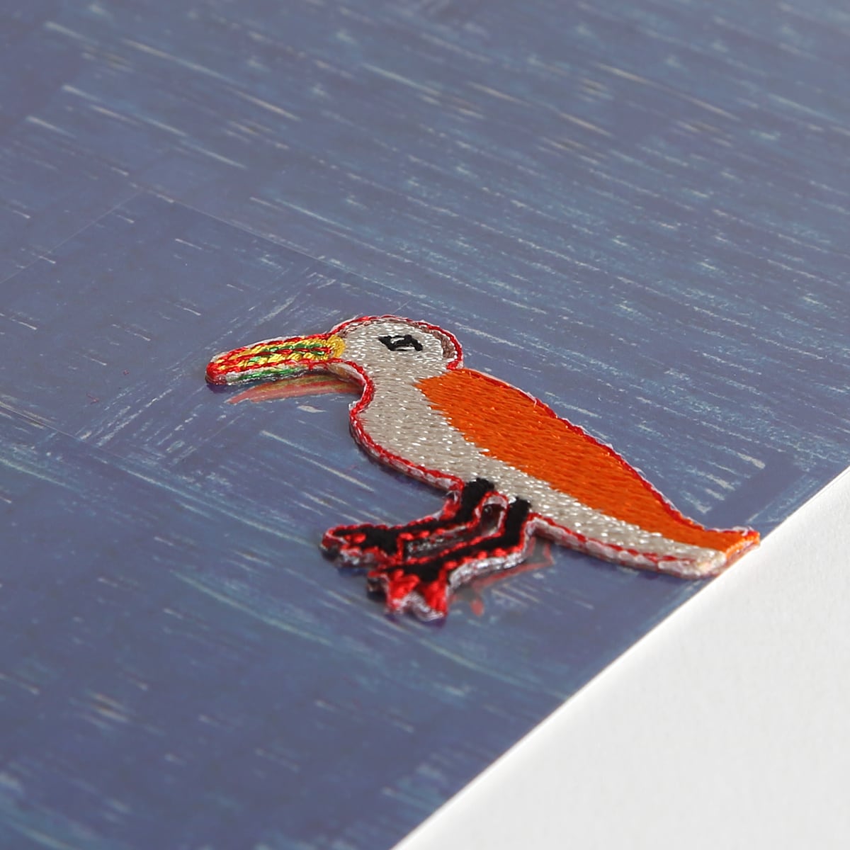 ワッペン付きのポストカード。ワッペンはアイロン・シール両用タイプ。手持ちのシャツやバッグにアイロンで圧着したり、スマホケースやノートに貼り付けたりと、アイディア次第で自由にカスタマイズできます。
