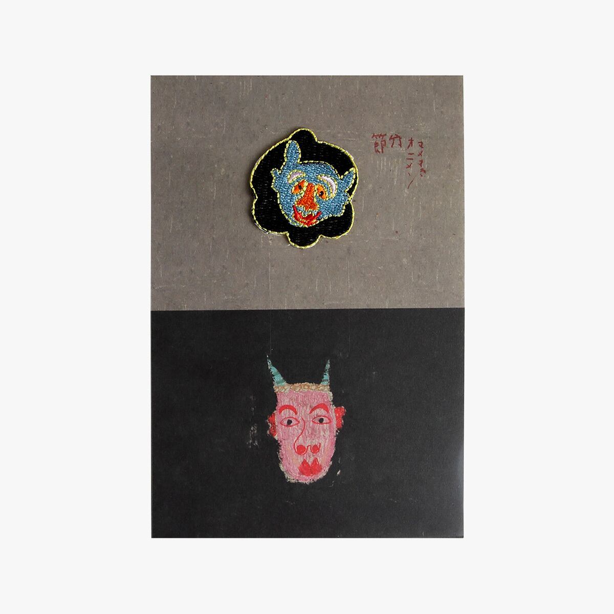 花びらが開いたような形と、明るい色で福笑いのように組み合わされた顔が、鬼にしては優しい印象を与えます。「節分」「オニメン(鬼面?)」「マメマキ」と書かれている文字もチャーミング。