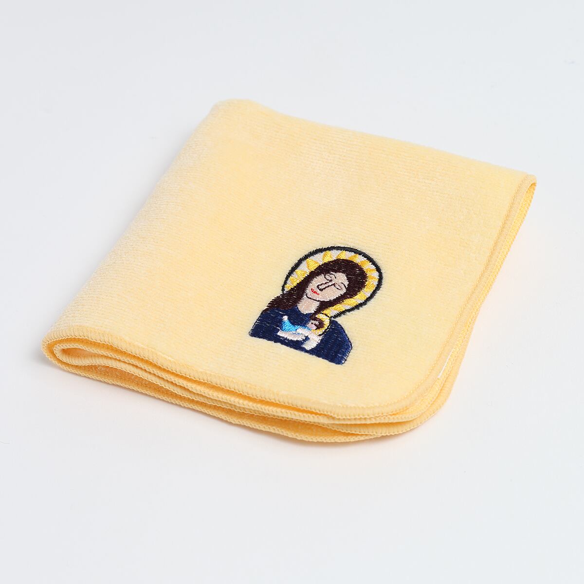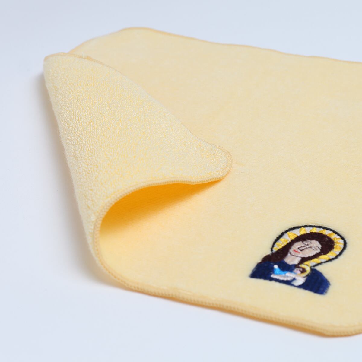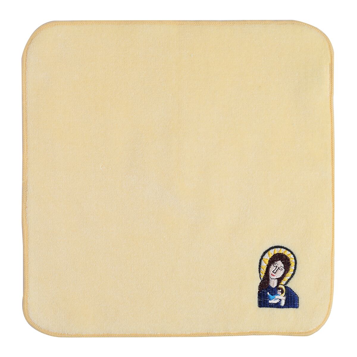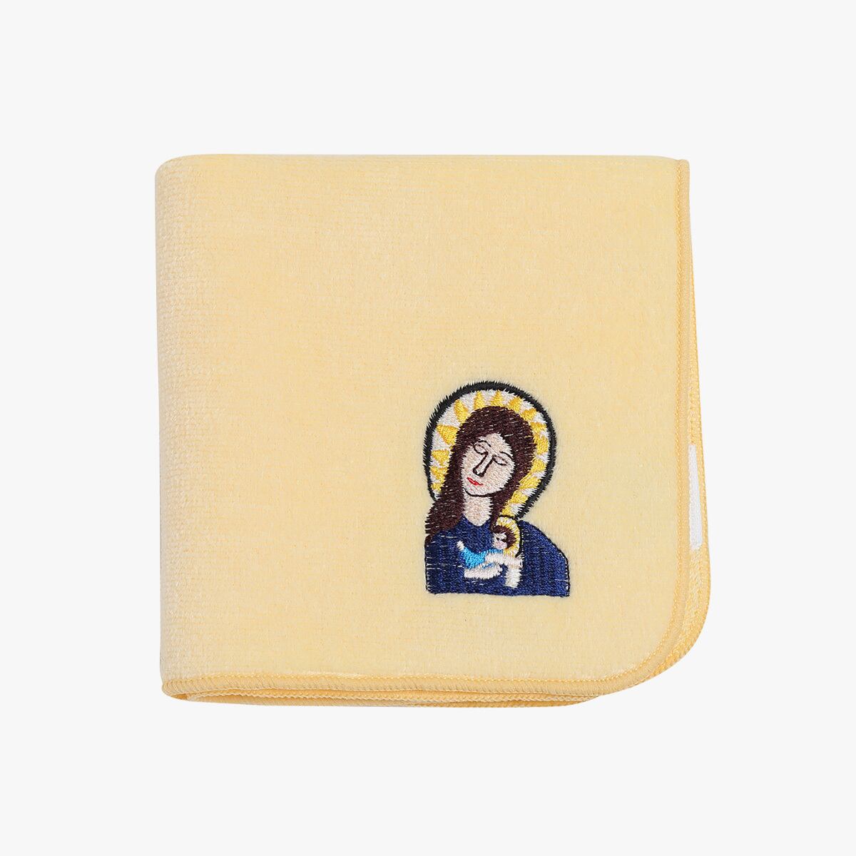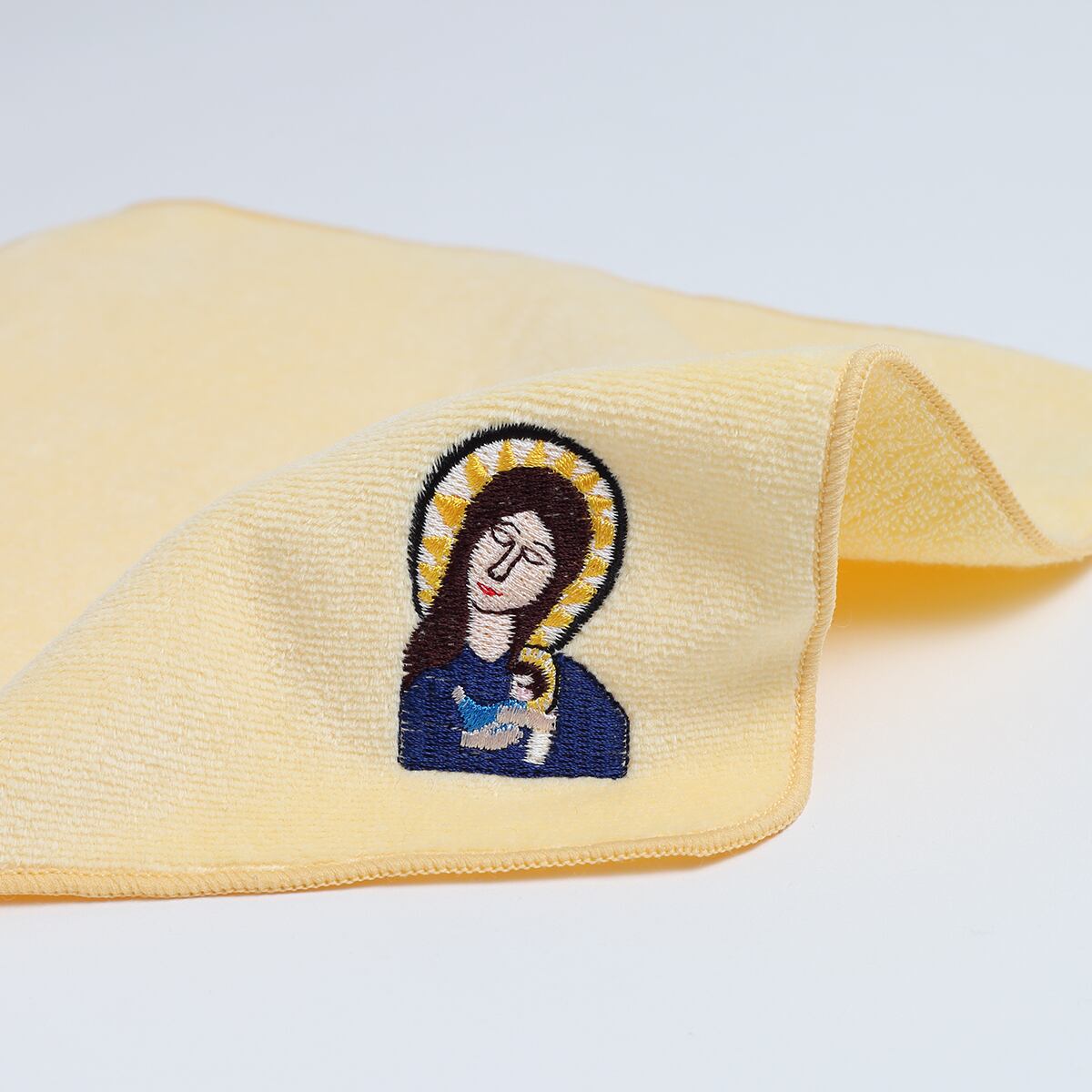 今治産のタオルハンカチに刺繍しました。タイトルは不明となっていますが、幼いイエスを抱く聖母マリアであることが想像できます。しっかりと包み込まれて安心して眠る赤ちゃんに呼応するように瞼を閉じる母の姿が印象的です。