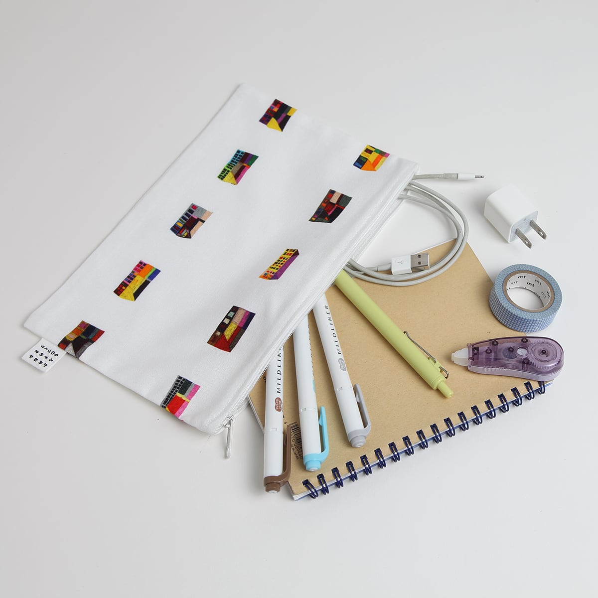 バッグの中にアート。マチのないタイプの平たいポーチは、使い方自由自在。
