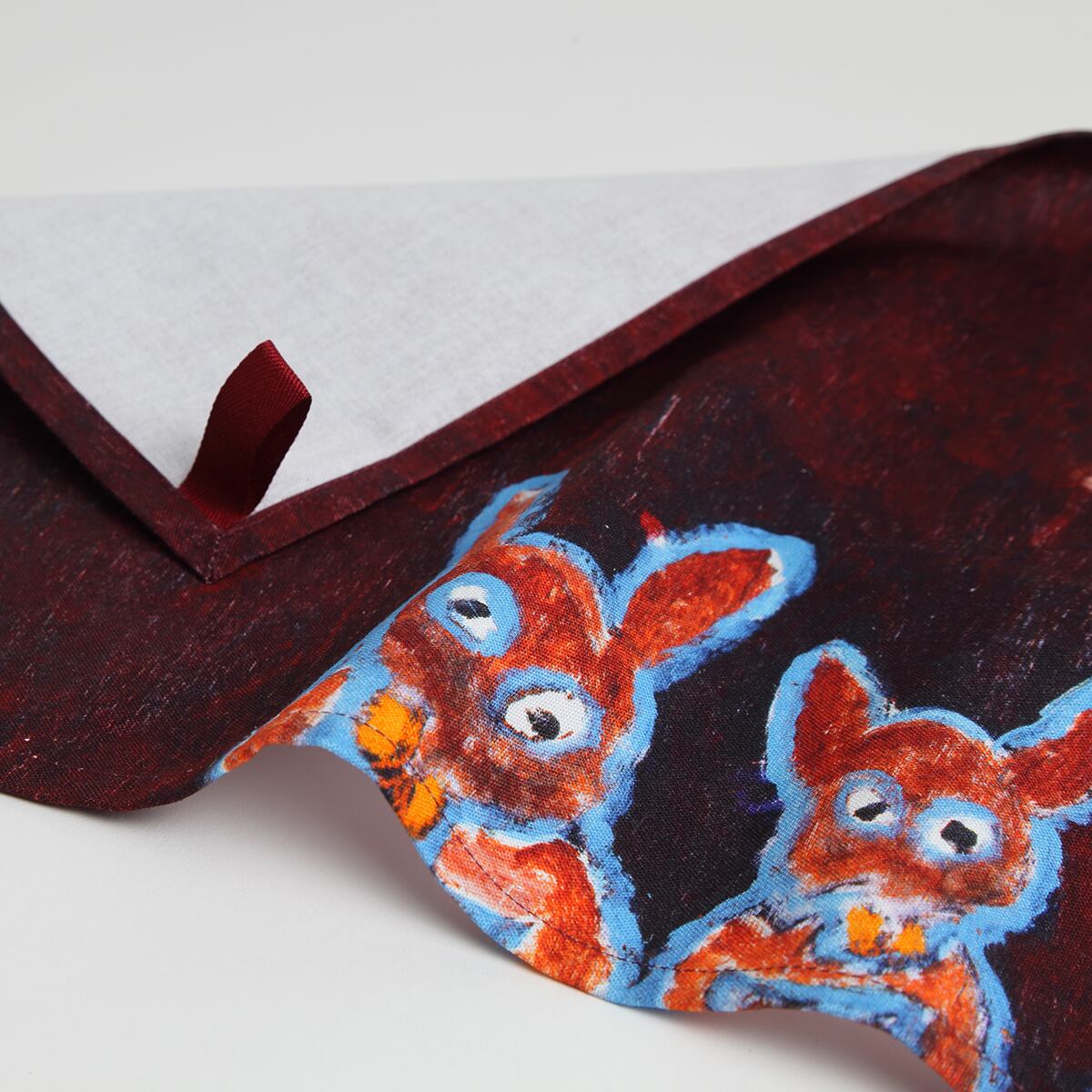 キッチンにアートを。ループのついたキッチンクロス。一人用のテーブルマットにしたり、ループをかけて布巾として使ったり、洗い終わった食器にかけたりと、様々な用途でお使いいただけます。