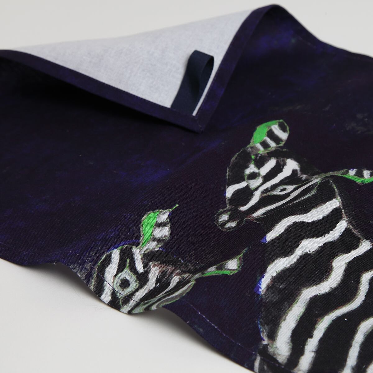 夜を彷彿とさせる深い青色を背景に佇む2頭のシマウマ。よく見ると目元や耳が黄緑色に縁取られていて、配色と構図の美しさから人気のある作品です。