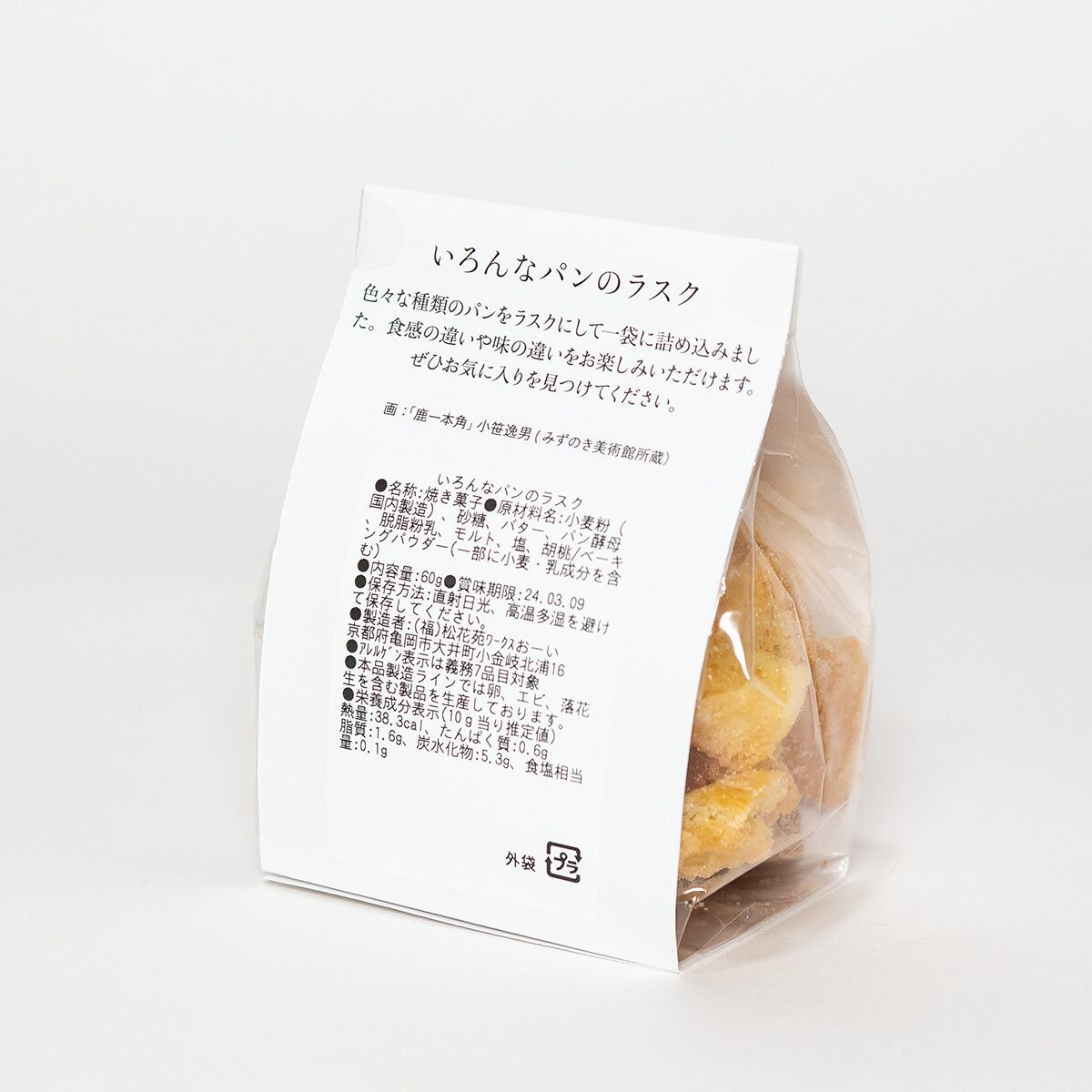 色々な種類のパンをラスクにして一袋に詰め込みました。食感の違いや味の違いをお楽しみいただけます。ぜひお気に入りを見つけてください。